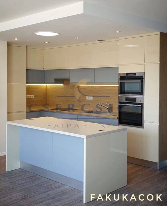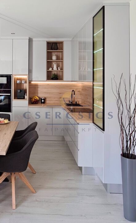 A magasfényű, lakkozott bútorfrontok modern és makulátlan összhatást keltenek.