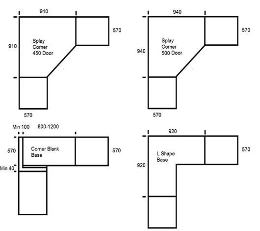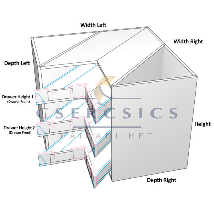 - L alakú sarokszekrény (2 ajtós, ami lehet jobbra-balra szétnyílós, vagy sarokszekrény pánt garnitúrával szerelve harmonikaajtós)