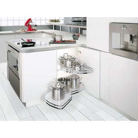 Vannak olyan megoldások is, amelyek olyan beépített polcelemeket tartalmaznak, amelyek a szekrényen belül teljesen körbeforgathatók. A tároló kapacitásuk, helykihasználásuk jelentős, a kosarakon kényelmesen elférnek egymás felett a különböző méretű, magasságú edények, miközben minden részletük egyszerűen, könnyen áttekinthető, hozzáférhető. Ezen vasalatoknak is több típusa van, a 3/4-es kosaras és a teli kosaras, valamint mindkét változatnak megvan az ajtóval együtt körbeforgatható kivitele is (ugyan ez szintén egy drágább megoldás, de a nyitott ajtó nincs útban pakoláskor).