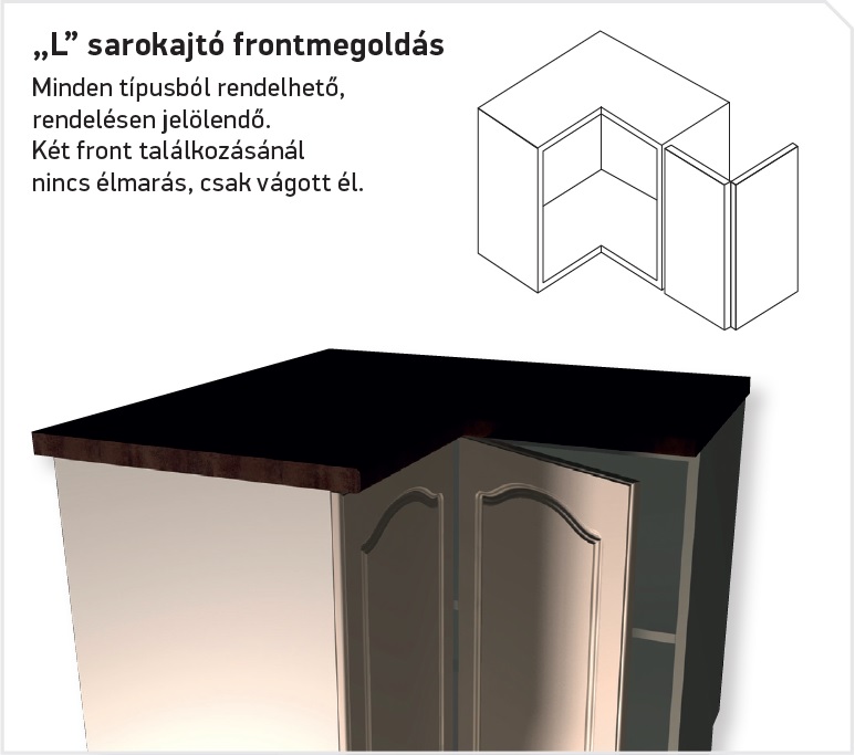 Belső 90°-os szekrények (sarokszekrények) frontjainál lehetőség van "L-sarokajtó" megoldást kérni. Ennek a marásnak az a lényege, hogy a 2 ajtó rátakar egymásra és a takart éleken nincs marás.