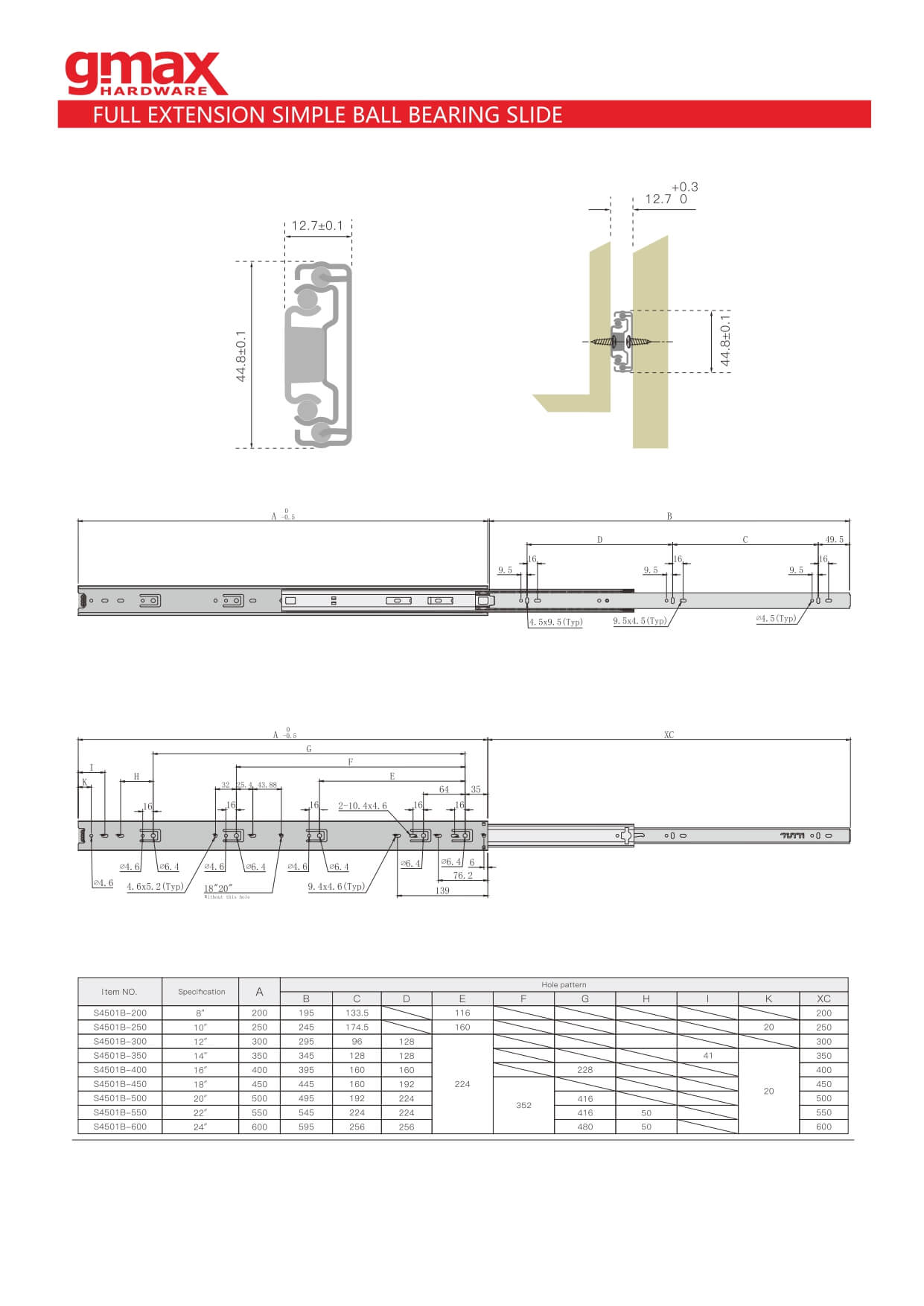 Teljes kihúzású golyós fiókcsúszó rendszer, 45 mm.
